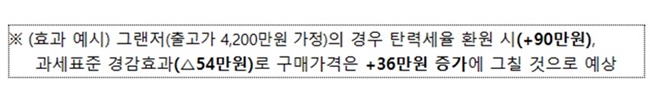 국산차 개별소비세 과세표준의 계산 방식에 대한 개선은 직접 차량 반출 시 부과되는 판매가격에서 기준판매비율(유통 관련 판관비 및 이윤 18%) 만큼 차감하여 현재보다 약 18%가 감소되는 효과가 나타날 전망이다.