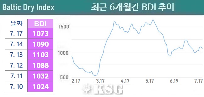7월17일 건화물선 운임지수(BDI)는 전일보다 17포인트 하락한 1073으로 마감됐다. 지난 주 후반 소강 상태를 보였던 벌크시장은 이날 중대형선 시장을 중심으로 하락세가 계속됐다. 한국형 건화물선 운임지수(KDCI)는 7월17일 기준 1만1220달러로 전일보다 120달러 하락했다.