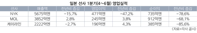 NYK의 1분기(4~6월) 영업이익은 전년 891억엔 대비 47.2% 감소한 471억엔(약 4300억원)에 그쳤다. 순이익 역시 735억엔(약 6700억원)을 기록하며 전년 3434억엔에서 78.6% 급감했다. 매출액도 15.7% 후퇴한 5675억엔(약 5조2000억원)으로 집계됐다.