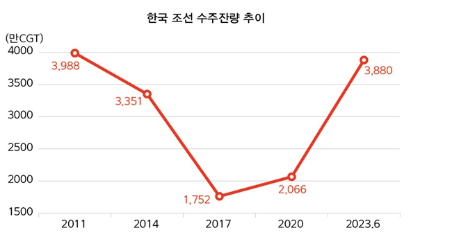 상반기 선가가 높은 선박을 쓸어 담은 한국 조선업은 수주잔량도 12년 만에 최고 수준으로 치솟았다. 올해 6월 말 국내 조선사들의 수주잔량은 3880만CGT로, 2020년 2066만CGT 대비 88% 증가했다. 일감 절벽에 독(Dock)이 개점휴업이 현실화된 2017년 1752만CGT와 비교해 121% 폭증한 수치다.