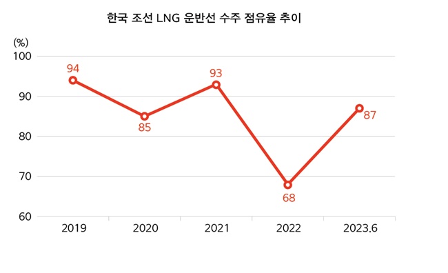 다만 우리 고부가·친환경선박은 전 세계 발주량의 61% 50%를 각각 점유하며 세계 1위를 수성했다. 특히, LNG 운반선은 전 세계 발주량의 87%를 쓸어 담으며 압도적 1위를 석권했다.