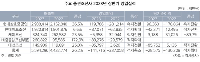 영업이익 합계는 2022년 -3370억원에서 올해 -1417억원으로 적자 폭이 축소됐다. 현대삼호중공업이 약 1200억원의 영업이익을 올리며 실적을 견인했다. 다만, 5개 조선사 중 4곳은 적자 전환하거나 적자 폭이 확대된 것으로 나타나 대조를 보였다.