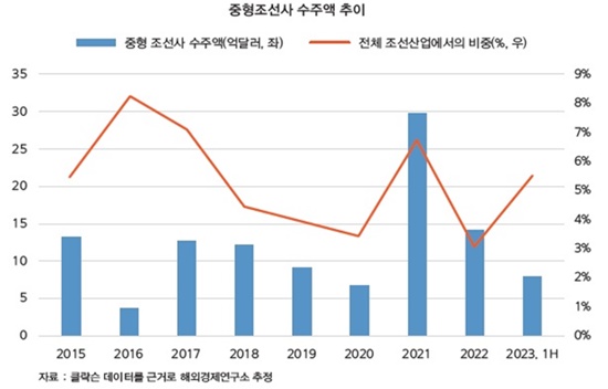 수출입은행에 따르면 국내 중견 조선사의 올해 상반기 선박 수주량은 12척 33만CGT(수정환산톤수)로 전년 대비 30% 감소했다. 대형조선사와 경쟁하며 수에즈막스급 탱크선과 9000TEU급 컨테이너선 등을 수주했지만 2021년 상반기 정점을 찍은 후 수주량이 점차 감소하고 있는 실정이다.