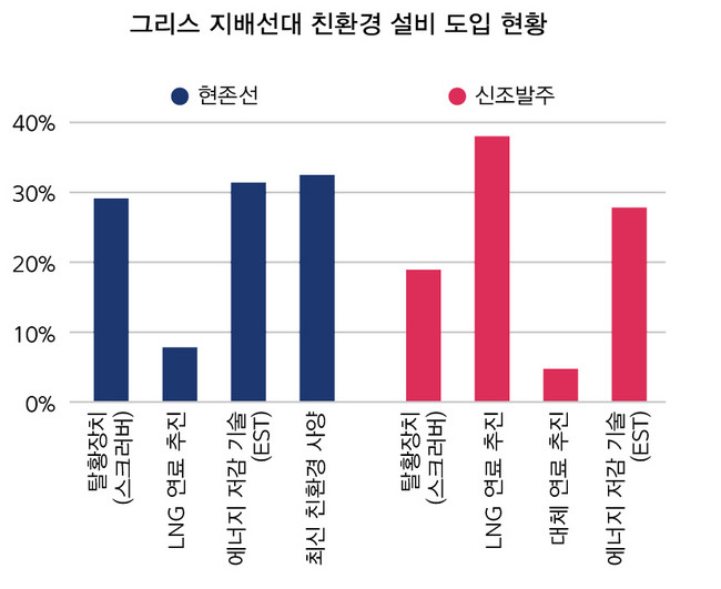 그리스 선주들의 신조선 발주 명단엔 국제 사회의 환경 규제에 대응해 LNG 연료를 쓰는 선박이 압도적인 비중을 차지하고 있다. 37%의 신조선이 LNG 이중연료 엔진을 장착한 선박들이다. 탈황장치(스크러버)를 단 선박 비중은 18% 정도로 집계됐다.