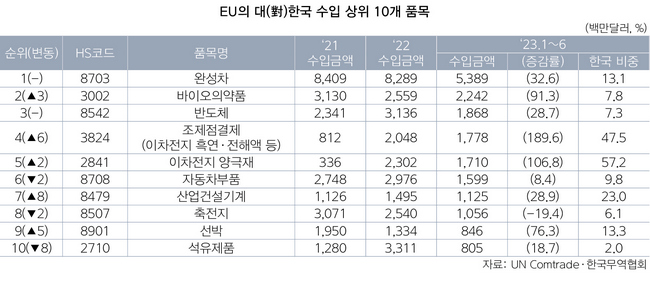 전기차, 이차전지, 바이오의약품 3가지 항목이 EU행 수출시장을 이끌었다. 올해 1~6월 EU가 우리나라에서 수입한 상위 10개 품목은 △완성차 △바이오의약품 △반도체 △조제점결제 △이차전지 △양극재 △자동차부품 △산업건설기계 △축전지 △선박 △석유제품 등이다. 유럽연합통계국(Eurostat)이 발표한 상반기 EU의 수입 상위 10개 품목(자동차, 원유, 가스, 석유제품, 자동차부품, 완제의약품, 통신기기, 원료의약품, PC부품, 반도체)과 유사한 순위다. KITA 보고서는 특히 이차전지 소재(양극재 107%, 흑연·전해액 190%) 바이오의약품(91.33%) 완성차(32.6%) 품목의 수입액이 전년 동기 대비 대폭 늘었다는 점에 주목하면서 이를 기반으로 우리나라의 EU 수출 전망 또한 밝을 것으로 내다봤다.