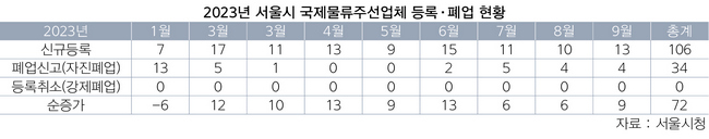 서울시의 경우 올해 3분기 신규 등록 건수는 작년 같은 시기와 엇비슷한 데, 문을 닫은 업체가 2배 가까이 적어 포워더 순증가분은 11곳 늘어났다. 서울시청에 따르면 신규 개업한 올해 3분기 포워딩업체 수는 전년 동기 대비 2개 감소한 34개를 나타냈다. 자발적으로 폐업하거나 서울시청으로부터 영업자격을 박탈당한 업체(등록취소) 수는 1년 전 같은 시기에 견줘 9곳 줄어든 13개사로 파악됐다.