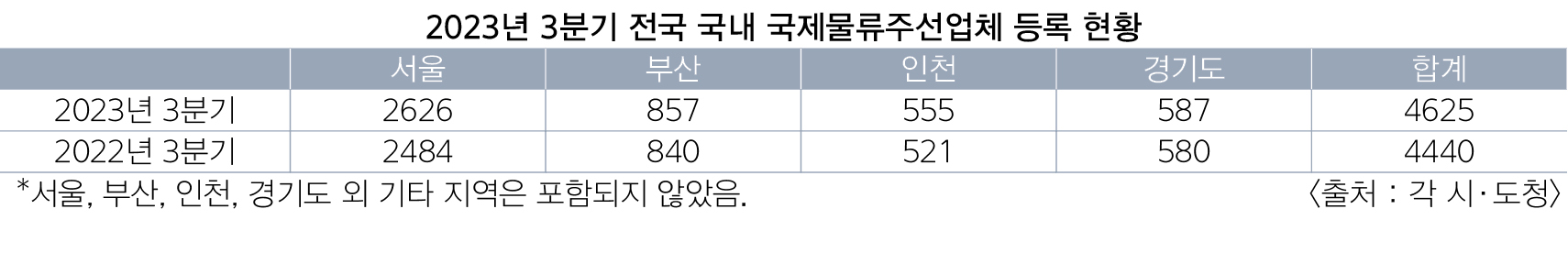 본지 자체 조사 결과 올해 9월 말까지 서울 부산 인천 경기도 등 국내 주요 지역에서 영업 중인 포워딩업체 수는 전년 동기 대비 200개 늘어난 4625개로 집계됐다. 지역별로 보면 서울이 2626개사로 가장 많고 부산 857곳, 경기도 587곳, 인천 555곳 순이었다. 1년 전 같은 시기에 견줘 서울은 142개, 나머지 3곳은 각각 17개 7개 34개 늘어났다.