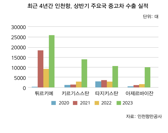 인천항의 중고차 수출 증가 원인을 한국은행에선 러시아행 우회 수출 물량으로 봤다. 러시아-우크라이나 전쟁으로 글로벌 완성차 업체들이 러시아 내 공장을 중지한 데 이어 서방의 대(對)러 수출 금지 조치가 취해지면서 러시아는 신차 판매량이 급감했다. 이에 따라 중고차 수요가 늘고 우회 통로로 사용되는 주변국으로 수출이 몰렸다는 분석이다. 올해 상반기 인천항에서 수출된 물량은 튀르키예 2만6009대, 키르기스스탄 1만3898대, 타지키스탄 1만598대, 아제르바이잔 9918대 등으로 각각 전년 동기 대비 181%, 384%, 270%, 549% 상승한 수치다.