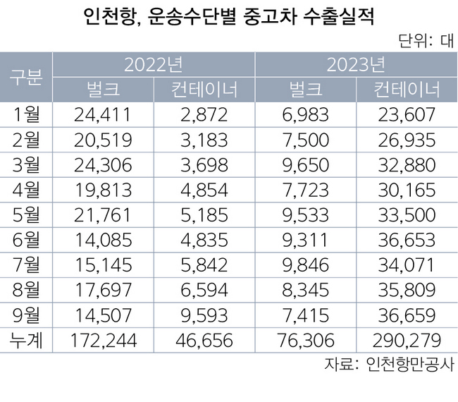 상반기 해외로 수출한 중고차는 지난해 같은 기간에 비해 63% 급증했다. 이 중 인천항을 통해 수출된 중고차는 56.9% 상승한 23만 4614대로 나타났다. 인천항만공사(IPA)에 따르면 역대 최고를 기록했던 2019년 상반기 19만5656대보다 20% 가까이 증가해 상반기 수출 최대치를 달성했다. 3분기에도 7월 4만3917대, 8월 4만4154대, 9월 4만4074대를 기록하면서 연일 호조를 그렸다. 3분기를 포함한 누계 수출 물량은 36만6585대로 추산된다. 가장 많이 수출한 2019년 41만9872대 기록까지 5만3287대를 남기고 있어 남은 4분기에도 호조가 이어지면 연 수출 최대 기록을 달성할 전망이다.