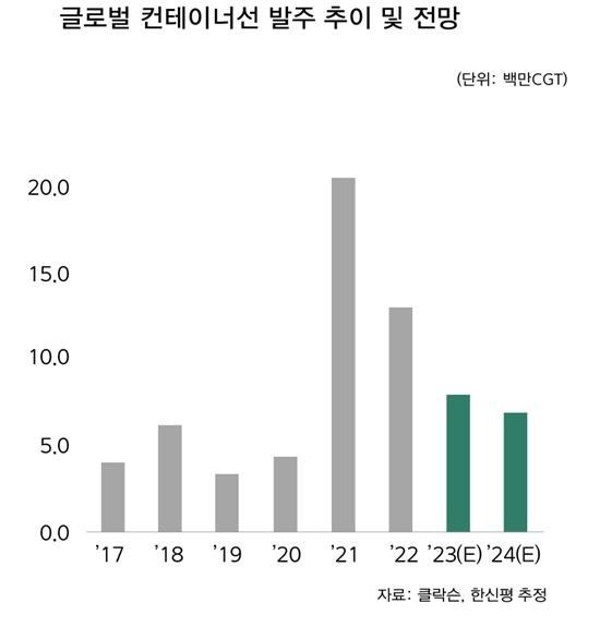 효자 선종인 컨테이너선과 LNG 운반선이 국내 조선사들의 수주량 감소를 이끌 것으로 분석됐다. 올해 컨테이너선 발주량은 전년에 견줘 약 40% 감소한 800만CGT, 2024년엔 2023년 추정치 대비 12% 줄어든 700만CGT를 각각 기록할 것으로 관측됐다. 올 들어 컨테이너 운임이 크게 하락한 데다 향후 신조선 홍수로 시황 회복이 당분간 쉽지 않아 발주가 주춤할 거란 분석이다.
