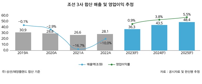 한신평은 HD한국조선해양 삼성중공업 한화오션의 합산 매출액은 올해 36조3000억원에서 내년 43조5000억원으로 20% 신장한 데 이어 2025년엔 48조4000억원으로 개선될 것으로 예상했다. 영업이익률도 2023년 0.9%에서 2025년 5.5%로 4.6%포인트 상승할 것으로 관측했다.