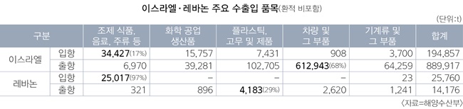 해수부에 따르면 무장 충돌 인근 지역인 이스라엘과 레바논을 기항하는 국적선사는 없는 데다 부정기선의 경우 화물 처리실적의 약 0.14%를 처리할 정도로 미미한 실정이다. 지난해 환적을 포함한 수출입 물동량은 이스라엘이 171만t(0.13%), 레바논이 10만7000t(0.01%)으로 각각 집계됐다.