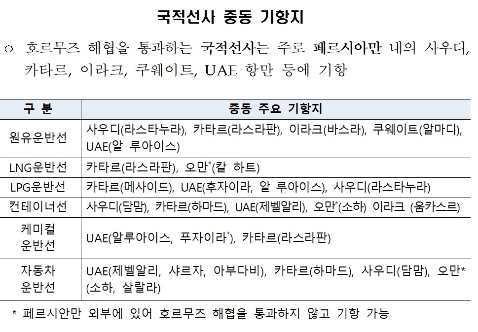 박성훈 해수부 차관은 “중동지역은 에너지 안보 차원에서 우리나라에 매우 중요한 해상 수송로”라며, “해수부는 관련 국제정세를 예의주시하며, 우리 국적선사 및 선원의 안전과 수출입 물류의 안정적 운송을 위해 선제적으로 대응해 나갈 것”이라고 말했다.