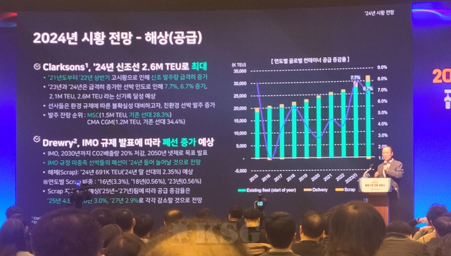 당장 내년부터 시작되는 신조선 폭탄도 해운 시장에 부정적으로 작용할 것으로 보인다. 최병석 삼성SDS 그룹장은 지난 1일 오후 대한상공회의소에서 열린 ‘2024 물류시장 전망 세미나’에서 “올해 해상 수요는 전년과 비슷한 수준에 머문 반면 공급은 역대 최고치인 7.7%의 증가율을 나타냈다”며 “클락슨은 내년 해운 수요와 공급은 전년보다 각각 3.6% 6.7% 늘어날 것으로 관측했다”고 밝혔다.