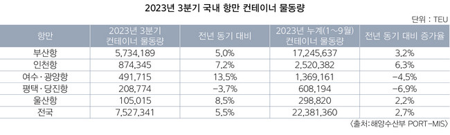 해양수산부에 따르면 올해 3분기 전국 항만 컨테이너 물동량은 전년 동기 대비 5.5% 증가한 752만7300TEU를 기록했다. 코로나19 이전 시기인 2019년(719만4400TEU)에 견줘 4.6% 상승했다. 수출입과 환적 화물은 모두 늘어났다. 수출입 물량은 1년 전 같은 시기에 견줘 6.0% 오른 431만1000TEU로 집계됐다. 이 중 수입과 수출은 각각 7.3% 4.7% 상승한 214만8400TEU 216만2400TEU였다. 환적 화물도 5.7% 증가한 317만6400TEU를 나타냈다.