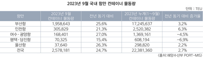 9월 부산항 물동량은 25.6% 오른 195만8600TEU였다. 3분기 수출입 화물은 4.5% 오른 265만2600TEU를 기록했다. 이 중 수입과 수출은 각각 6.1% 3% 늘어난 131만7200TEU 133만5400TEU를 냈다. 환적 화물도 5.5% 상승한 308만1600TEU를 거두며 승승장구했다.