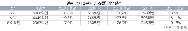 NYK의 2분기(7~9월) 영업이익은 전년 741억엔 대비 30.4% 감소한 516억엔(약 4500억원)에 그쳤다. 순이익 역시 398억엔(약 3500억원)을 기록하며 전년 3626억엔에서 89% 급감했다. 매출액도 13.3% 후퇴한 6008억엔(약 5조2000억원)으로 집계됐다.