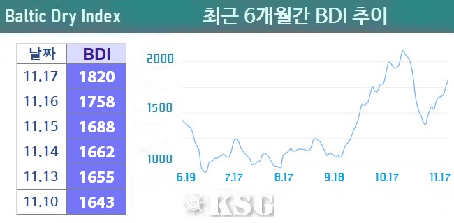 11월17일 건화물선 운임지수(BDI)는 전일보다 62포인트 상승한 1820으로 마감됐다. 지난 주 벌크 시장은 주 후반 물동량이 증가하면서 모든 선형에서 상승세로 마감됐다. 한국형 건화물선 운임지수(KDCI)는 11월17일 기준 전주보다 8% 상승한 1만6903달러로 발표됐다.
