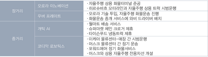 대표적인 자율주행 차량 기술회사 오로라 이노베이션은 아마존, 현대차, 도요타, 덴소 등 글로벌 기업의 전략적 투자를 받으며 장거리 운송에 주력했다. 올해 4월 자율주행 트럭을 상업적으로 운용할 수 있는 첫 번째 화물터미널을 준공한 데 이어 차량 부품 생산업체인 콘티넨탈과 시스템 구축 제휴를 체결하고 5월에는 콜드체인 운송업체인 히르슈바흐 모터라인과 함께 댈러스-휴스턴 간 자율주행 상용 트럭 시범 프로젝트에 착수했다. 오로라는 내년 말까지 텍사스 내에서 무인 자율주행 트럭 운송을 상용화한다는 계획이다.