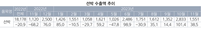 산업통상자원부에 따르면 우리나라의 올해 11월 선박 수출액은 전년 11억2000만달러 대비 39% 급증한 15억5100만달러(약 2조원)를 기록했다.