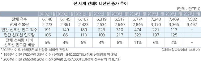 알파라이너에 따르면 전 세계 컨테이너 선단은 2025년 3170만TEU로 늘어나는 데 이어 2026년 2027년에 각각 3366만TEU 3492만TEU에 이를 것으로 예상된다.
