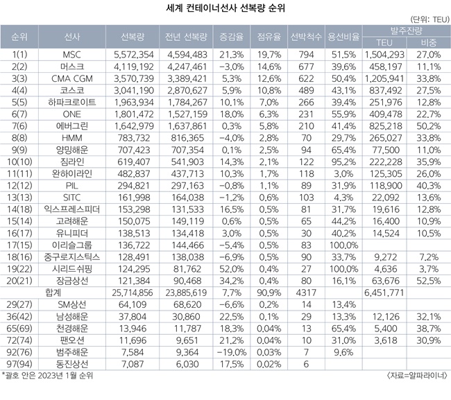 선복량 증가를 주도한 건 세계 1위 MSC로, 1년 새 선복량이 100만TEU 가까이 폭증했다. 전 세계 컨테이너 선대가 200만TEU 늘었는데, MSC가 절반가량을 책임졌다. 특히 MSC는 전년 17.5%에서 2.2%p 상승한 19.7%의 점유율을 기록, 전 세계 해운시장의 5분의 1을 장악했다.