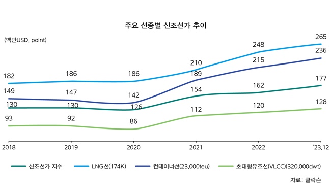 글로벌 발주량이 감소할 거란 관측에도 신조선가가 양호한 수준을 유지하고 있다는 건 조선사들에게 긍정적이다. 신조선가지수는 조선업계가 초호황 기였던 2008년 178p에 근접했다. 지난해 12월 말 클락슨 선가지수는 177포인트(p)를 기록, 3년 전 126p와 비교해 40%(51p) 상승했다.