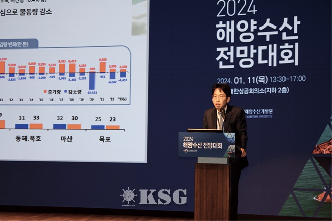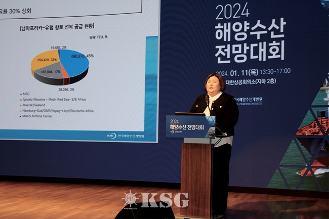 황수진 한국해양수산개발원(KMI) 해운시장연구센터장은 지난 11일 서울 대한상공회의소에서 열린 ‘2024 해양수산 전망대회’에서 올해 평균 상하이운임지수(SCFI)가 900~1100포인트(p)를 나타낼 것으로 내다봤다.