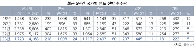 반면 중국은 60%인 2493만t을 수주해 세계 1위를 유지했다. 수주량은 전년 2589만t 대비 3.7% 감소한 반면, 점유율은 51%에서 9%p 올랐다. 3위 일본은 전년 580만t 대비 23.3% 감소한 445만t을 기록했다. 점유율은 전년과 동일한 11%인 것으로 집계됐다.