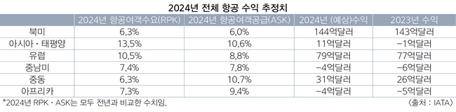IATA는 지난해 흑자 전환에 성공한 유럽과 중동 지역은 계속된 여객 수요 증가에 힘입어 올해 수익이 소폭 증가할 걸로 내다봤다. 올해 유럽과 중동은 각각 1년 전에 견줘 3.3% 4.8% 오른 79억달러 31억달러의 수익을 거둘 것으로 예상된다.