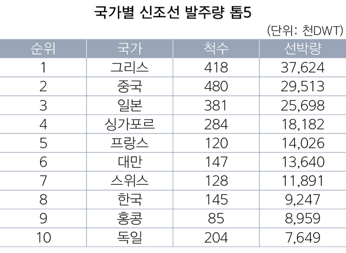 신조 발주량 순위에선 그리스가 418척 3762만t, 중국이 480척 2951만t으로 각각 1~2위를 차지했다. 지난해 3위였던 그리스는 발주량을 무려 2배 이상 늘리며 중국을 2위로 끌어내리고 1위 자리를 꿰찼다. 그리스 선주들은 벌크선과 탱크선 신조 주문을 3배 안팎으로 확대했다. 코로나발 해운 호황이 저물자 다시 선단 확보에 나선 것으로 보인다.