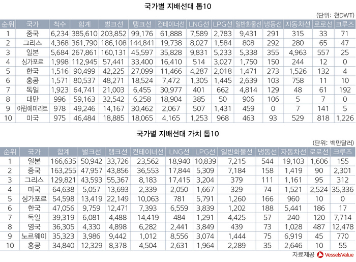 이어 일본 381척 2569만t, 싱가포르 284척 1818만t, 프랑스 120척 1402만t, 대만 147척 1364만t, 스위스 128척 1189만t, 우리나라 145척, 924만t, 홍콩 85척 896만t, 독일 204척 764만t으로 3~10위를 형성했다. 현존선 규모가 10위권 밖인 프랑스와 스위스가 신조 발주 순위에선 톱10에 포함된 게 눈길을 끈다. 새롭게 톱10에 진입한 독일도 신조선 증강에 나서며 해운력 재건에 나섰다.