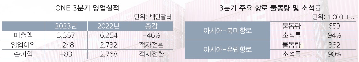 ONE은 영업보고서에서 2023회계연도 3분기(10~12월)에 영업이익 -2억4800만달러(약 -3300억원), 순이익 -8300만달러(약 -1100억원)를 각각 거뒀다고 밝혔다. 1년 전의 27억3200만달러 27억6800만달러에 견줘 영업이익, 순이익 모두 적자 전환했다.