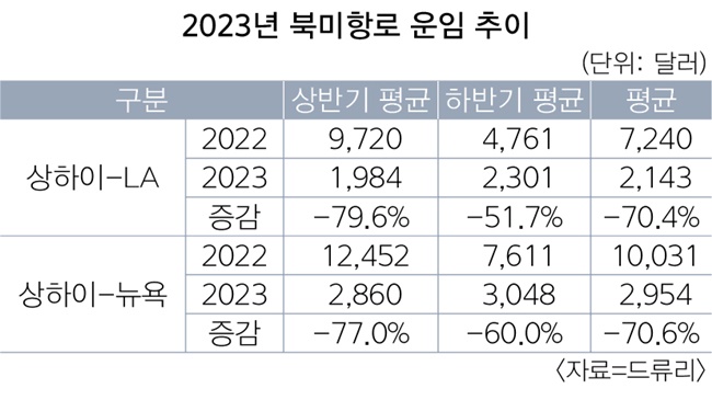 영국 해운조사기관인 드류리에 따르면 지난해 상하이-로스앤젤레스(LA) 구간 평균 운임은 40피트 컨테이너(FEU)당 2143달러를 기록, 1년 전의 7240달러에서 70% 하락했다.