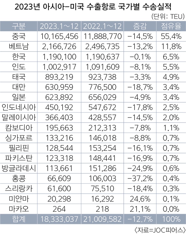 미국 해운조사기관인 JOC피어스에 따르면 2023년 아시아 18개국발 미국행(북미수출항로) 컨테이너 물동량은 1833만3000TEU로, 1년 전 2101만TEU에 견줘 12.7% 감소하며 1년 만에 2000만TEU대가 붕괴됐다.