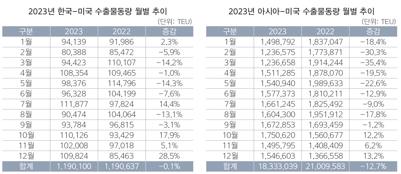 우리나라는 2021년 110만TEU를 미국으로 수송하며 사상 처음으로 100만TEU를 넘어선 뒤 이듬해 119만TEU를 실어 날랐다. 지난해 수송 실적은 전년 대비 0.1% 감소한 119만TEU에 그쳤다.