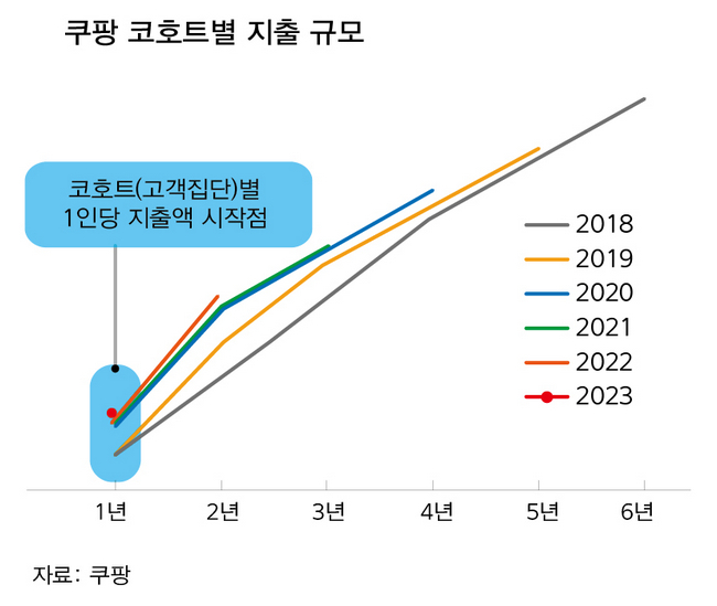 회사는 멤버십을 바탕으로 성과를 이어가겠다는 구상이다. 공시에 따르면, 와우멤버십에 가입한 연도별로 분류한 고객집단(코호트)의 지출은 매년 15% 이상 증가하고 있는 것으로 집계됐다. 신규 코호트는 기존 코호트보다 1인당 지출액의 시작점이 더 높고, 지출액 증가 규모가 가파르다는 특징을 보인다.