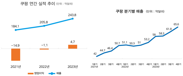쿠팡INC는 지난 한 해 영업이익 4억7300만달러(약 6174억원), 당기순이익 13억6000만달러(1조7800억원)를 거뒀다고 밝혔다. 전년 실적 -1억1200만달러 -9200만달러에서 흑자 전환했다. 연 매출은 30조원을 돌파했다. 1년 전 205억8300만달러와 비교해 약 18% 성장한 243억8300만달러를 기록했다. 연평균 환율(2022년 1291.95원, 2023년 1305.41원)을 각각 적용하면 26조5900억원에서 31조8300억원으로 20% 증가한 셈이다.