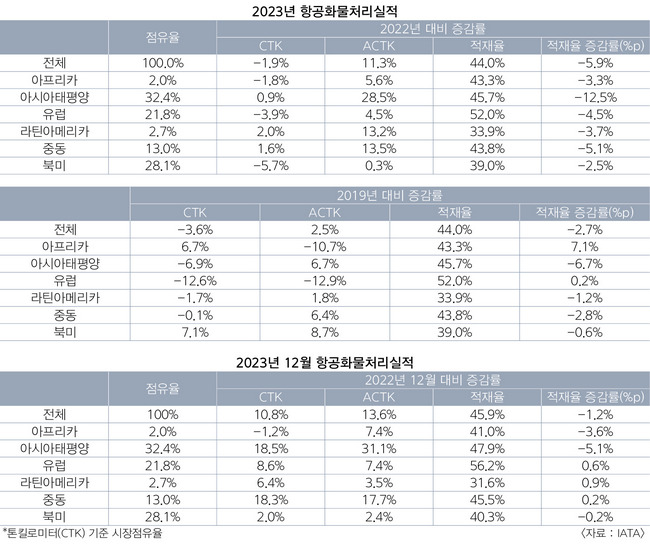 2023년 CTK는 상반기 내내 계속된 수요 부진의 영향을 받아 여전히 마이너스 성장에 그쳤으나, 감소율은 2022년에 견줘 6.1%p(포인트) 개선되며 수요 감소폭이 완화됐다. 특히 2022년 약세를 보였던 아시아·태평양과 중동 지역의 CTK가 플러스 성장으로 돌아섰고, 유럽도 수요 회복에 탄력을 받으며 주요 지역에서 유의미한 성과를 거뒀다.