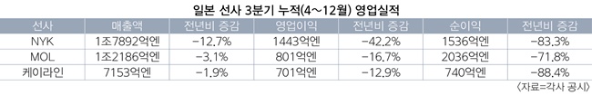 NYK의 지난해 4~12월 영업이익은 전년 2494억엔 대비 42.2% 역신장한 1443억엔(약 1조3000억원)에 머물렀다. 순이익 역시 1536억엔(약 1조4000억원)을 기록하며 전년 9204억엔에서 83.3% 급감했다. 매출액도 12.7% 감소한 1조7892억엔(약 15조9000억원)으로 집계됐다.