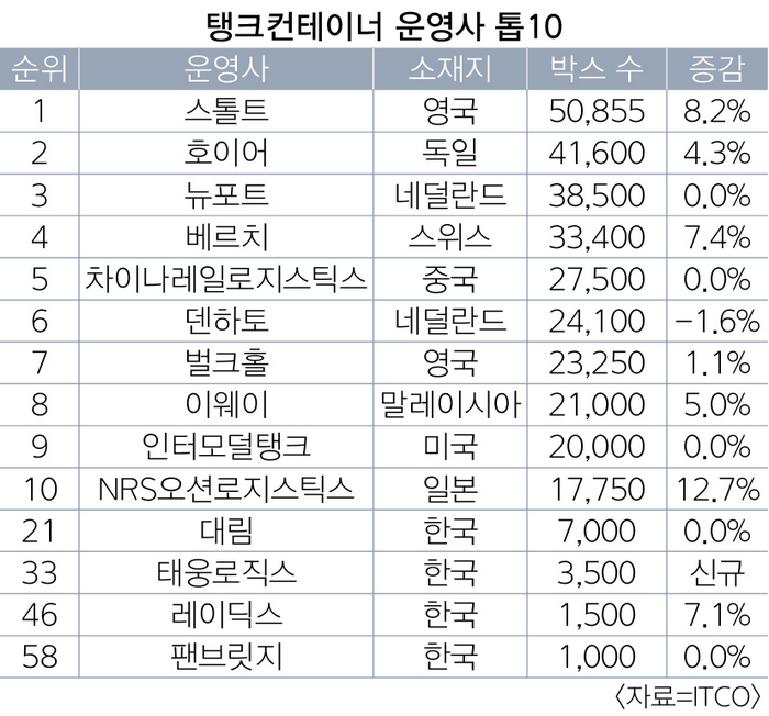 운영사별 보유량 순위는 10위까지 지난해와 같다. 노르웨이 선사 스톨트닐센의 자회사인 스톨트탱크컨테이너가 8% 늘어난 5만855개로, 처음으로 5만개를 돌파했다.
