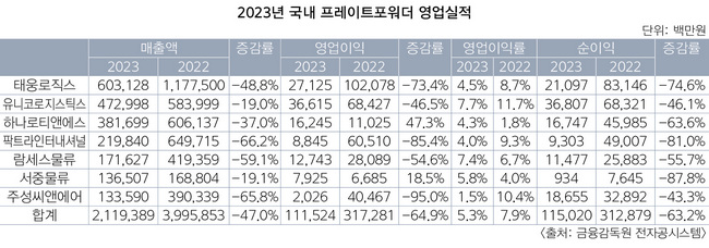 금융감독원 공시에 따르면 2023년 국내 주요 프레이트포워더 7개사의 별도(개별) 기준 매출액 합계는 총 2조1194억원으로 전년 대비 47.0% 감소했다. 영업이익과 순이익도 각각 1115억원 1150억원으로 64.9% 63.2% 줄어들었다. 프레이트포워더 7개사의 평균 영업이익률도 역신장했다. 이들의 작년 영업이익률은 5.3%로, 전년보다 2.6%p(포인트) 하락했다.
