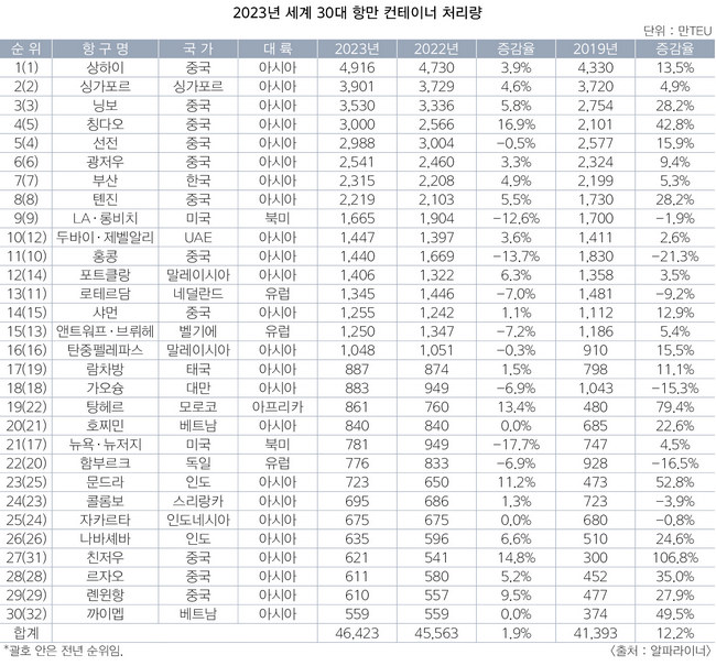 프랑스 해운조사기관인 알파라이너에 따르면 지난해 전 세계 30대 항만이 처리한 컨테이너 물동량은 4억6423만TEU를 기록, 전년(4억5563TEU) 대비 1.9% 증가했다. 코로나19 이전 시기인 2019년(4억1393만TEU)에 견줘 12.2% 상승했다.