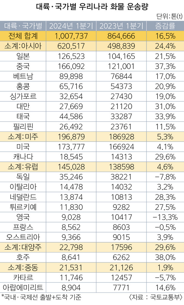 대륙·국가별 실적도 대체로 강세였다. 우리나라와 항공 교역량이 가장 많은 아시아 지역은 24.4% 오른 62만1000t을 기록했다. 아시아에서 비중이 절반 가까이 차지하는 중국과 일본은 각각 16만6100t 12만6500t으로 37.3% 21.5% 증가했다.
