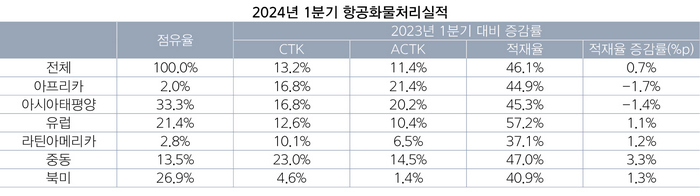 지역별로 살펴보면 아시아·태평양 북미 유럽 등 전 지역에서 수송 수요가 증가했다. 전 세계에서 항공화물량 비중(33.3%)이 가장 큰 아·태 지역의 1분기 CTK는 전년 동기 대비 16.8% 증가했다. 중국 춘절 이후 생산 활동이 일시적으로 멈추면서 2월(18.1%)과 3월(14.3%) 수요 증가폭은 점차 둔화됐으나, 올해 첫 달 20%대가 넘는 가파른 수요 성장세가 전체 실적을 견인했다.