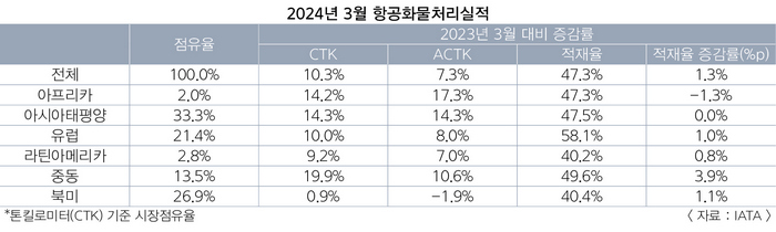 두 번째로 점유율(26.9%)이 큰 북미 지역 CTK는 전년 동기 대비 소폭(4.6%) 늘어나는 데 그쳤다. 이 지역 수송 실적도 올해 1분기 내내 플러스 성장을 거듭했지만 전 지역 통틀어 가장 낮은 증가율을 이어갔다. 3월 북미-유럽 노선의 수요는 2.9% 증가했고, 아시아-북미 노선도 4.7% 상승했다.