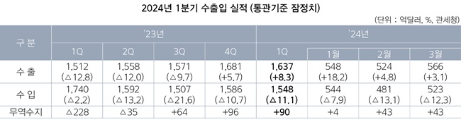 1분기 총수출액 8% 증가…반도체·자동차 호조