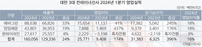 각사 공시에 따르면 올해 1분기 3개 선사의 영업이익과 당기순이익 총액은 각각 258억대만달러(NTD, 약 1조1000억원) 314억NTD(약 1조3000억원)로 2023년 같은 기간 94억NTD 63억NTD에서 각각 2.7배(174%) 5배(396%) 급증했다.