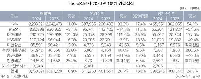 국적선사들의 1분기 영업실적은 엇갈린 모습을 보였다. 원양 컨테이너선은 양호한 모습을 보였지만 근해 컨테이너선은 약세를 보였다. 벌크선사들의 희비도 교차됐다.