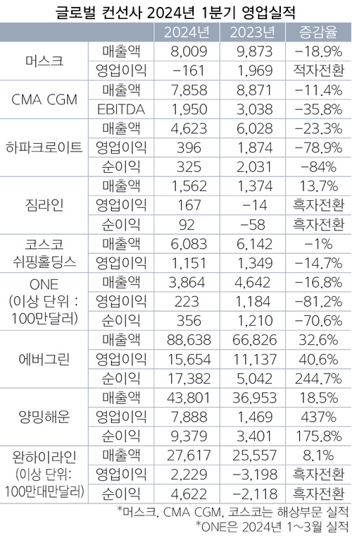 컨선사 영업실적 희비…짐라인·완하이 흑자전환·머스크 적자